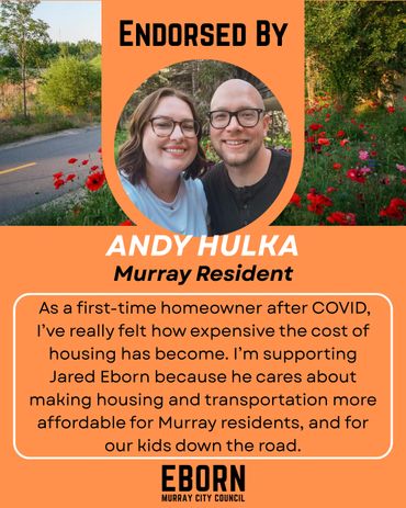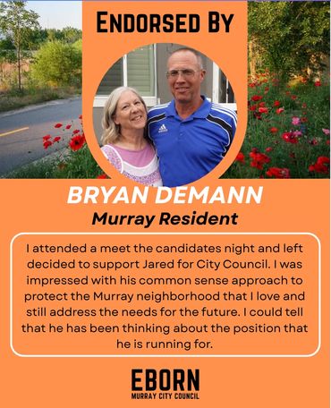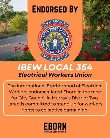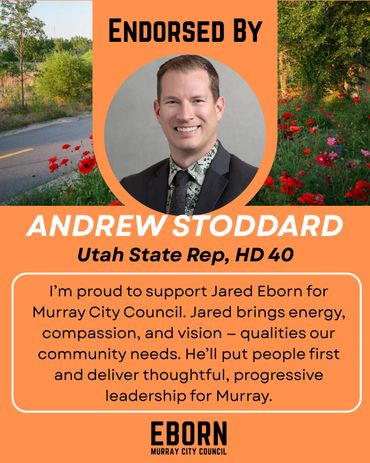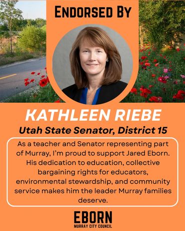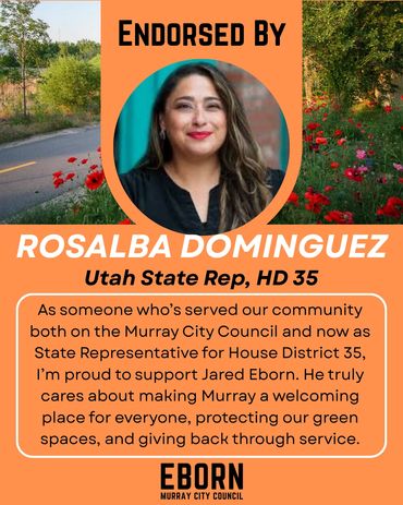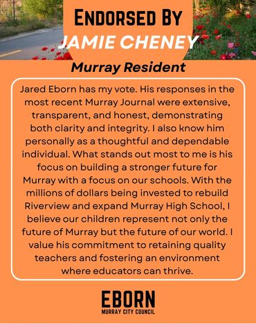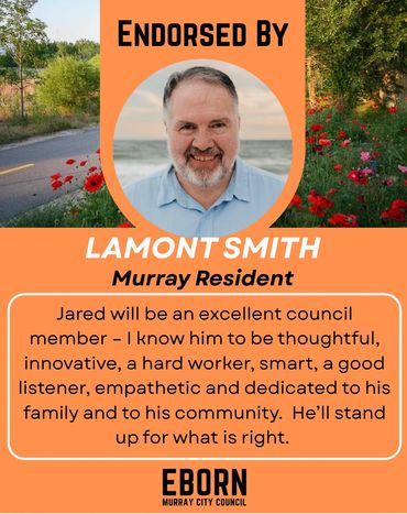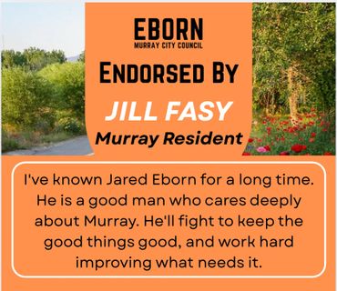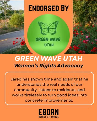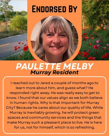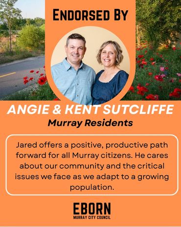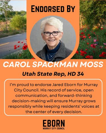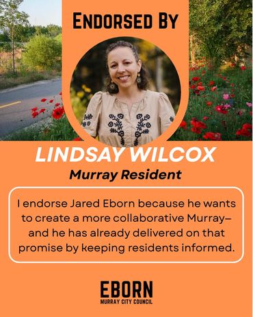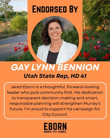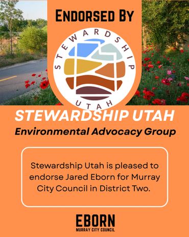 Every candidate will have endorsements to one degree or another - in fact, every vote is a private endorsement that reflects trust. Public endorsements matter because they also reflect that trust - from people who've seen the work, share the values and believe in a thoughtful, forward-thinking member of their community on the Murray City Council. I'm honored by their confidence in me and they inspire me to earn yours at the ballot box.
